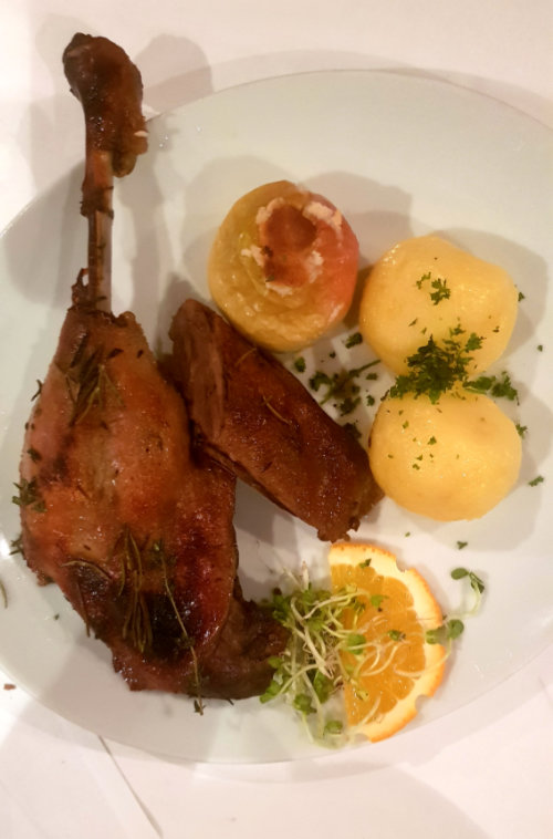 Das Restaurant war passend zur Jahreszeit mit herbstlichen Dekorationen und Kerzenlicht geschmückt. Ein wahrer Genuss für Augen und Gaumen war das Menü: Zarte Gänsekeulen oder -brust mit deftigen Beilagen wie Rotkohl, Kartoffelklößen und hausgemachter Soße.